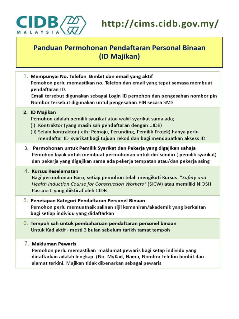 Boleh ke muat turun surat permohonan kebenaran beroperasi melalui cims cidb? Contractor registration online/pendaftaran kontraktor · construction personnel card registration/pendaftaran kad. Terms and conditions × ok cancel cancel. Make sure the internet connection is avaiable and you're definitely online before trying again. However, due to technical issues between the systems there is a delay in cscs, cpcs and cisrs card achievements being uploaded. Register online as a contractor. Features comprehensive sae management within cims with automatic sae email. Online portal to get / renew cidb green card. Go to cims cidb page via official link below. Mcore akan diperkenalkan kepada gred g1 dengan 4 kriteria. Cidb malaysia makes it easier with cims kuala lumpur. Kini terdapat pembayaran online menggunakan pfx dan kad kredit bagi memudahkan pengguna; Data should automatically upload onto the construction training register and online card checker from the cscs and nocn systems.